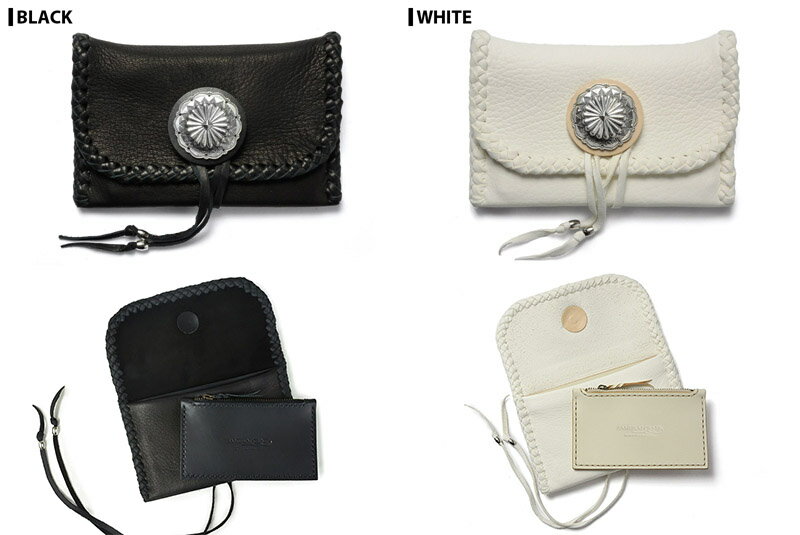 ◎雑誌掲載 Lightning(ライトニング) vol.280 2017年8月号 RUDO(ルード) vol.74 2017年10月号 RUDO(ルード) vol.76 2017年12月号 CAT:0000000116■品名:ミドルウォレット エルクスキン ■素材:エルクスキン、(コインケース・その他)ブラック=サドルレザー/ホワイト=ヴォーノアニリン ■サイズ:本体=W155×H105×D15mm(コンチョありの場合D20mm)、ジッパーウォレット=W125×H75×D5mm ■サンプルコンチョ:SW-302(38mm) ■仕様: フリーポケット×2 カードポケット×2 ジッパーウォレット×1 ※外周は革レースでのメキシカンループステッチ。