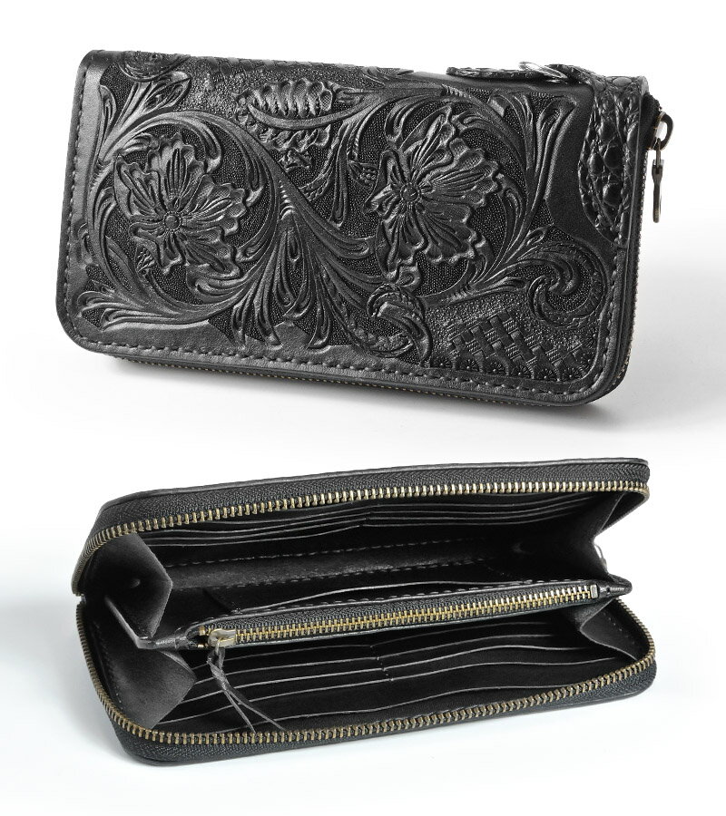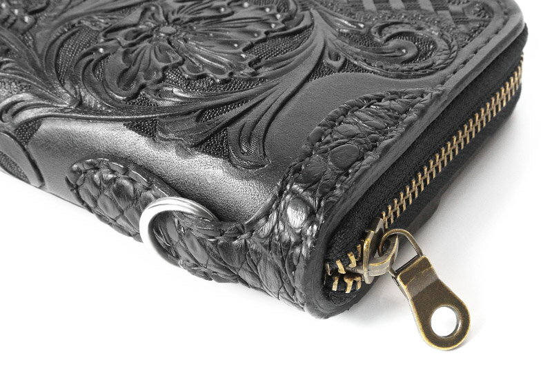 ギフト対応 ■品名:ラウンドファスナーロングウォレット [TYPE-1] ■素材:サドルレザー、ワニ革、ツーリングレザー ※表面ツーリングレザーはカービング後ブラックに染色してあります。
